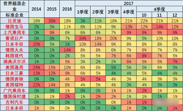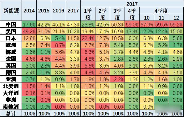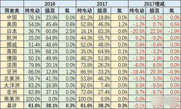 17年世界新能源車的動力格局基本沒有變化,氫燃料仍是0.3%的微小數量,技術線路格局的插混和純電動基本保持穩定。 這樣的世界穩定是中國與日本的反向推進的結果。中國是純電動增多,日本是搞增城電動車,形成較大的分化的特征。 以上表格是17年與16年的對比的狀態。世界基本是三分之一插混,三分之二純電動。中國是28分化,20%插混,81%純電動。 我感覺中國方向是對的。日本太扣了,一切以消費者利益為中心,日本缺乏引導行業發展的超前思路,中國更為超前意識。 5、17年全年的中國新能源份額47%