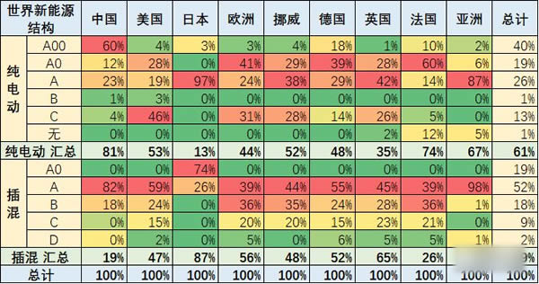 世界新能源車的發展線路差異較大,中國的線路比較務實的A00級微型電動車為主,17年占到中國純電動的60%,德國的比例也相對較好,在18%,但德國的A0級小型電動車較多,中國在新能源車還是比較好的務實發展。美國的大型電動車占到46%,是偏大的。 中國的插混與其他國家相一致,而日本的A0級比較多,這是日產的NOTE增程電動車的較好表現。 4、世界新能源車的線路分化